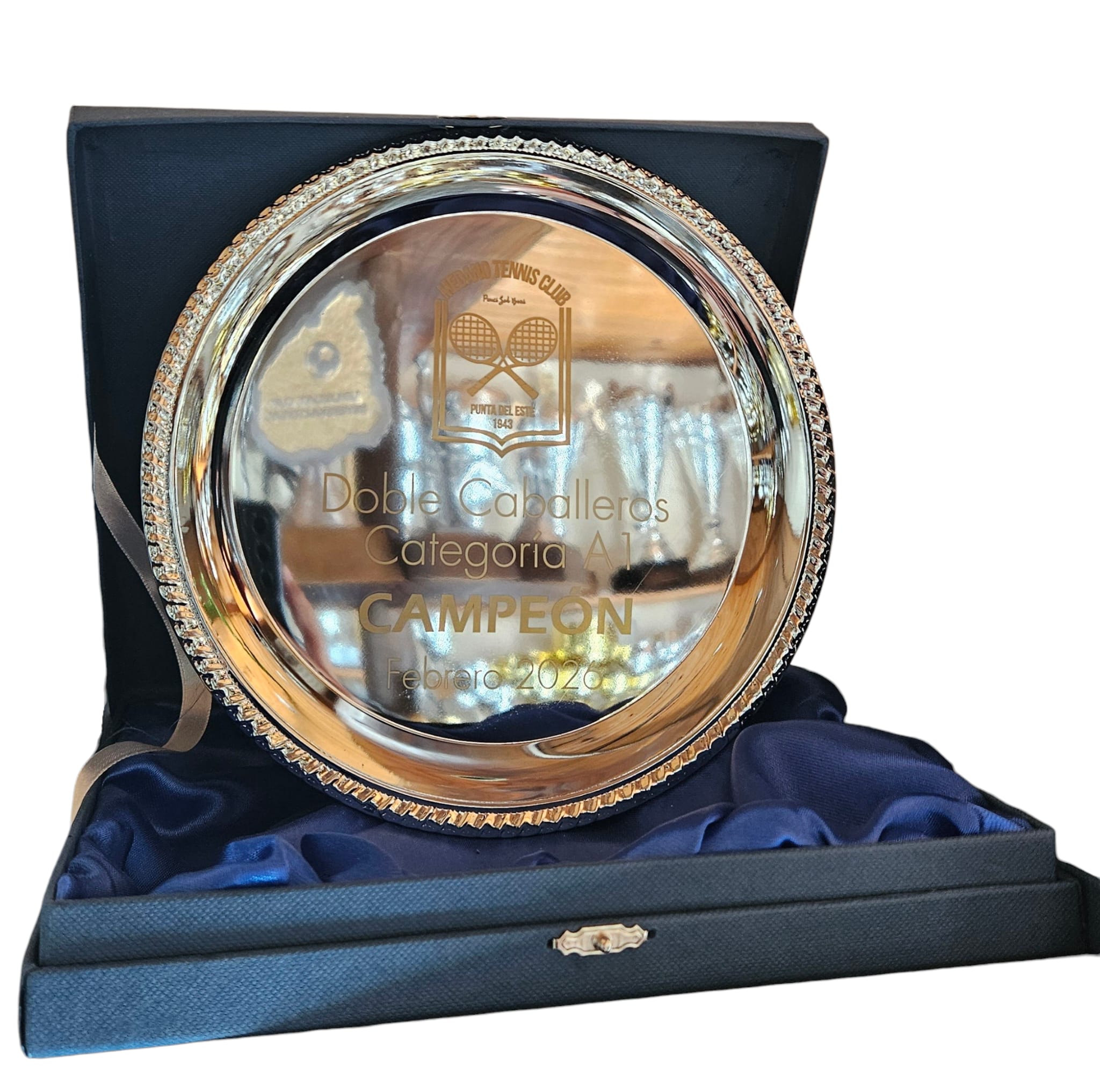 Plato de premiación metálico con acabado plateado brillante y grabado láser personalizado. Presentado en estuche rígido con interior satinado azul, ideal para reconocimientos deportivos y distinciones especiales.