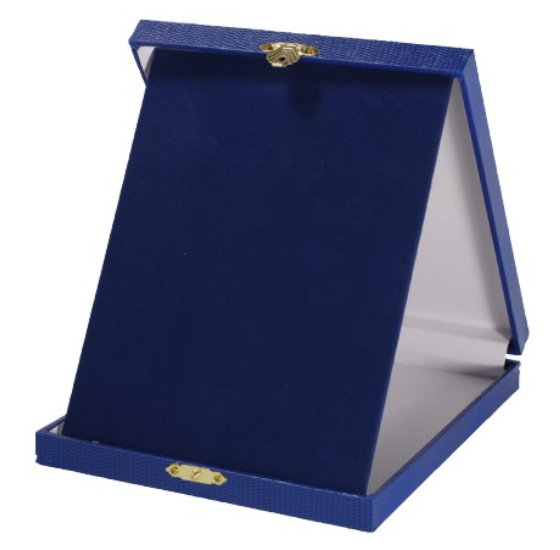 PLAQUETAS EN ESTUCHE AZUL, FORMATO HORIZONTAL. CHAPA PLATEADA O DORADA
