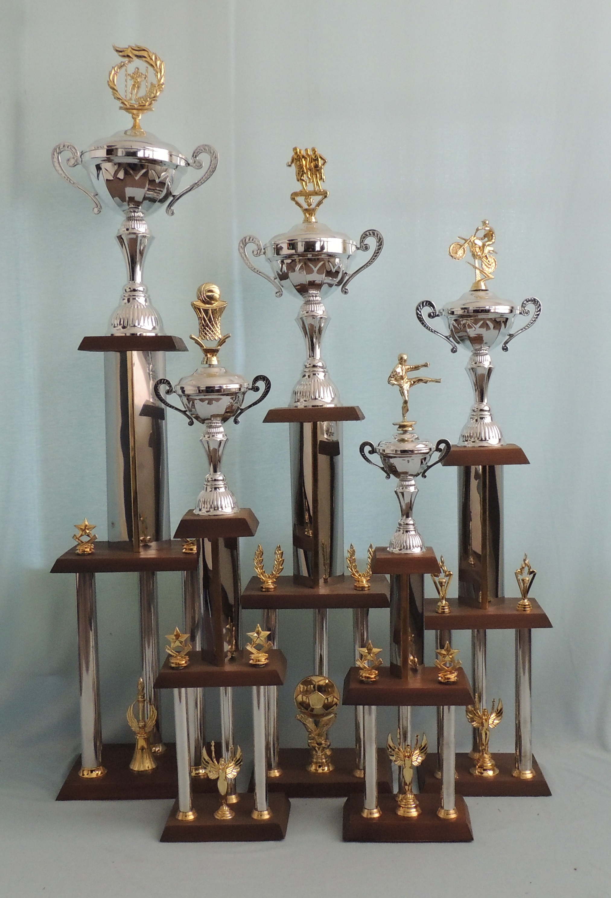 TROFEOS CON CAÑOS DE METAL, COPA EN METAL Y BASES DE MADERA