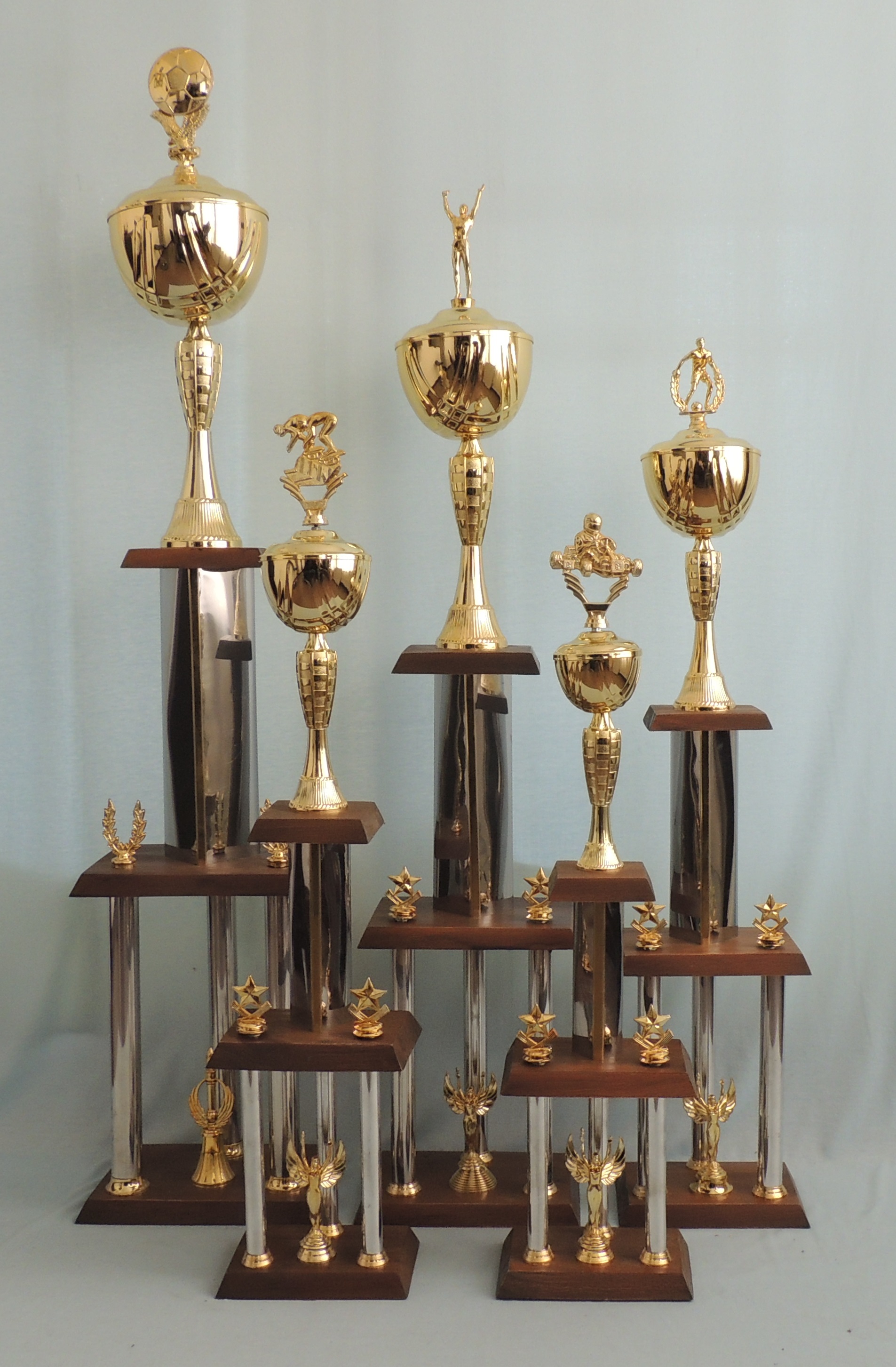 TROFEOS CON CAÑOS DE METAL, COPA EN METAL Y BASES DE MADERA