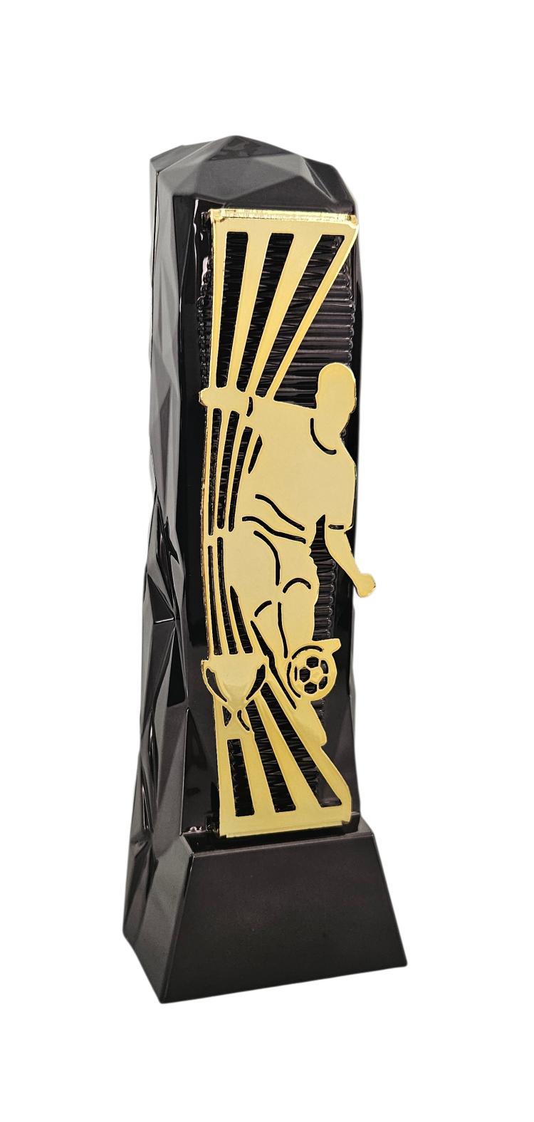 Trofeo de FUTBOL en plástico metalizado, con silueta de jugador en dorado, cuerpo negro facetado y base sólida. Diseño moderno y elegante para premiaciones.
