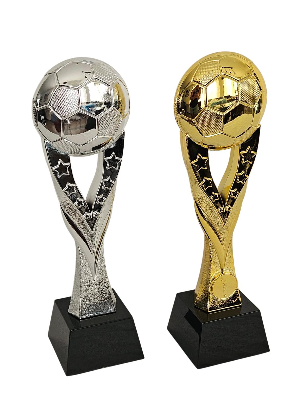 Trofeo de fútbol con balón en la parte superior, estructura estilizada con estrellas caladas y acabado metalizado (plateado o dorado), montado sobre base negra.