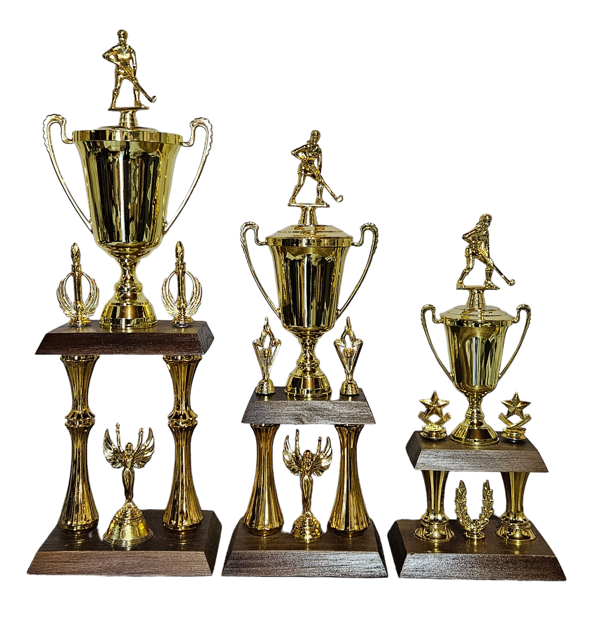 TROFEOS CON COPA METALIZADA, CAÑOS DE METAL Y MADERA